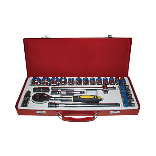 10 ổ cắm tiêu chuẩn (8-24mm), 1 Tay cầm bánh cóc nhanh và 1 Thanh mở rộng 5"